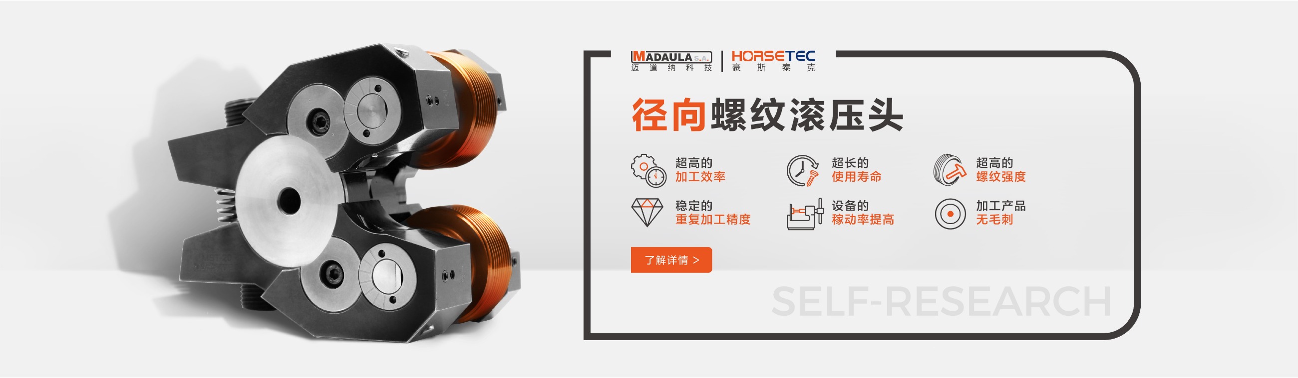 豪斯泰克HORSETEC · 花鍵花紋滾壓頭 有:軸向花紋滾壓頭、徑向花紋滾壓頭、滾花刀等。 -- 滾壓頭替代了單刃刀具加工螺紋效率低、成本高的問(wèn)題,在一次裝夾一個(gè)工序上加工完成,可以減少95%的螺紋加工時(shí)間,降低生產(chǎn)成本。 -- 延伸系數(shù)達(dá)到5%的材料都可以進(jìn)行滾壓加工。 -- 如果在有芯軸支撐的狀況下,薄壁空心零件也可以進(jìn)行滾壓加工。 -- 可用于大多數(shù)類型的機(jī)床:數(shù)控機(jī)床、鉆床、單軸車床、多軸機(jī)床、轉(zhuǎn)盤(pán)式機(jī)床、CNC車床、加工中心、走心機(jī)、專機(jī)及縱切機(jī)床等。